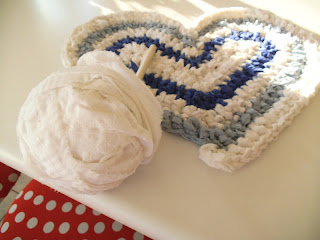 Crocheted heart shaped rag rug. | CRAFTS--CROCHET